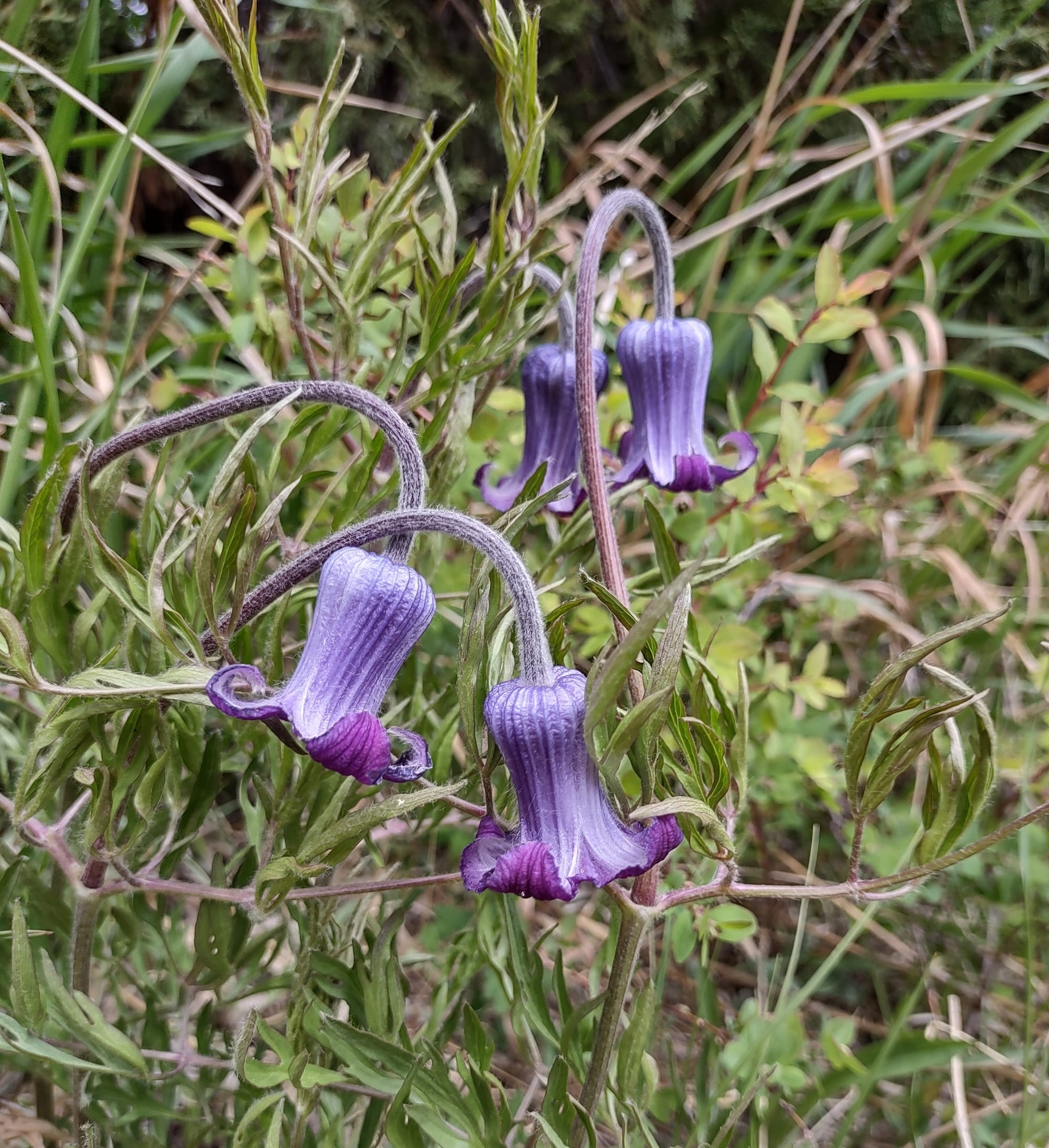 Now by and large, Clematis are characterized by their vining habit: the vast majority of Clematis species are tendrilous climbers, but here and there we have a handful of upright, self-supporting herbaceous species. The Hairy Clematis is one of these anomalies: often found growing in shortgrass meadows, talus slopes and mixed-pine understories, this plant stands at around a foot tall without structural assistance. It has nodding, bell-shaped flowers that never open entirely, and of the three species we'll be discussing today it's perhaps my favorite. It also boasts the most limited range of the three, stochastically distributed over lower-elevation zones of the Southern Rockies.